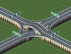 第1案を選択すると一番困るのは1タイル64×64mとすると・・・高速道路は128m・・・うう、デカイ。ということで、道路の横に併走という案はどーしても遠慮がちになってしまう。64m幅の道路などそうそうないので多少デフォルメ化するとしても、高速と道路を併走させて3タイル(192m)を用意するのはちょっとキビシイ。
